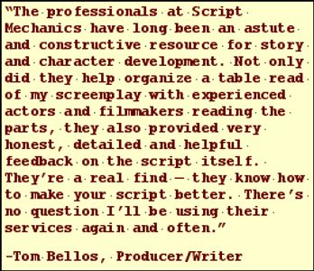 A co-founder of Script Mechanics, a screenwriting workshop, which sponsors the CinemaSpoke Screenwriting Contest, I work directly with screenwriters to improve their screenplays and to hone their skills while nurturing their storytelling and refining their screenplays.